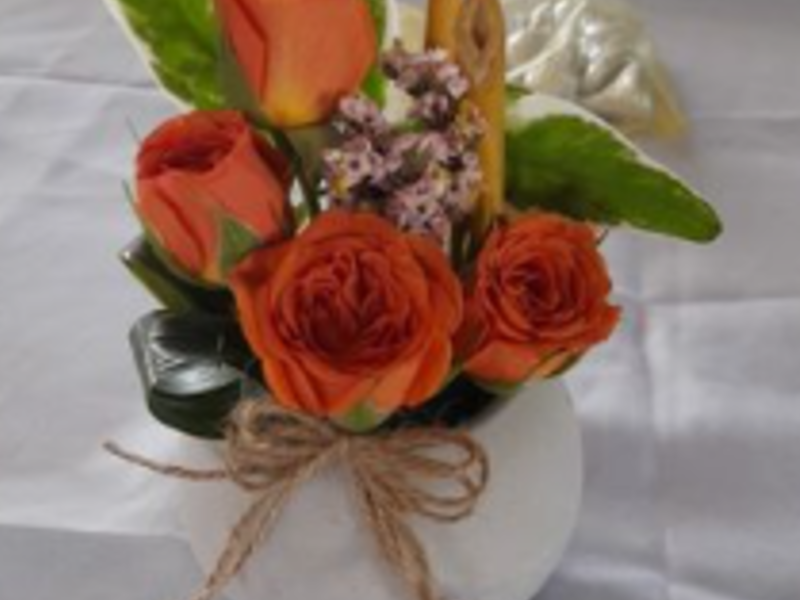 Un arreglo de flores naturales en un recipiente decorativo colocado en el centro de una mesa. Puede incluir una variedad de flores y follaje para crear un punto focal encantador.